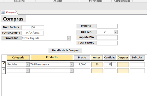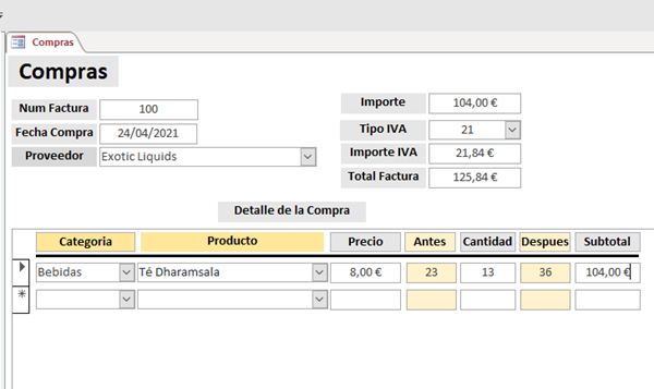 Y tengo un formulario Compras con un subformulario DetalleCompra( éste subformulario sería como tu formulario). Elijo el producto( y en Antes me pone las existencias de ese producto hasta ese momento, no harñia falta pero...), el precio al que lo compro y puedes ver que el cursor está en el control Cantidad, que sería tu control Pedido.