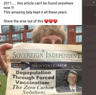 Y las personas que se han pronunciado sobre el uso de la vacuna como control de la población por parte de las élites globales para ayudar con el calentamiento global y reducir la población humana a una cantidad considerable para que las élites puedan generar un nuevo orden mundial se han llamado locos de la conspiración.