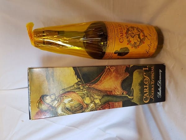 En cuanto al precio, se le ha indicado una estimación baja y otra alta, por ejemplo 30-75€. Cerca de 30 sería un precio bajo pero justo, cerca de 75 sería un precio alto y también justo, pero por debajo de 30 ya sería un precio inadecuado, que no se presenta en el mercado o para botellas en peor estado de conservación. Por encima de 75 sería un precio anormal, y podrían los coleccionista no comprarle nada, la horquilla está en el precio más probable de una venta de verdad.