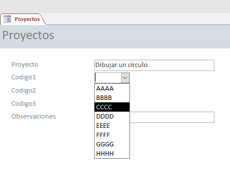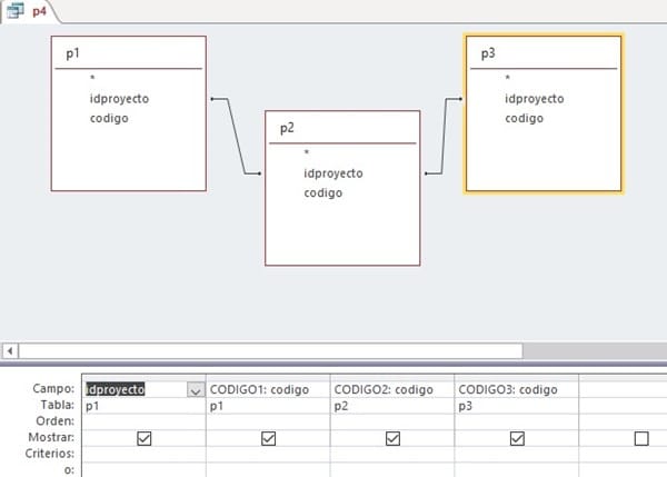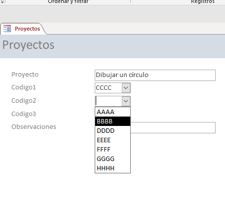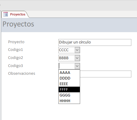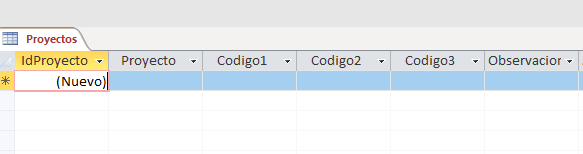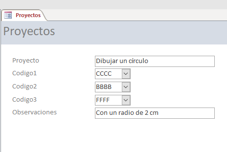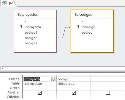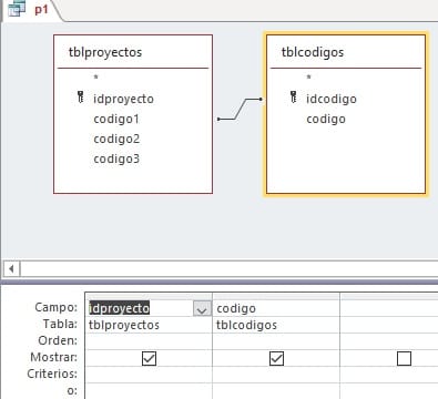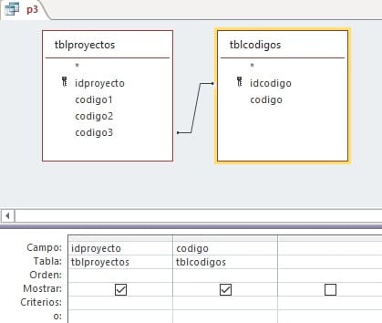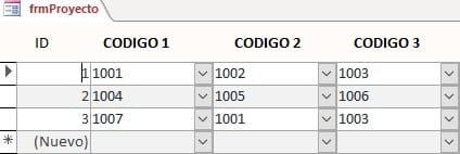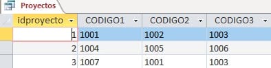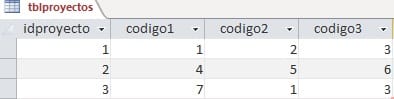 Por lo tanto, en la tabla "proyectos" tenemos tres campos "codigo1", "codigo2" y "codigo3".