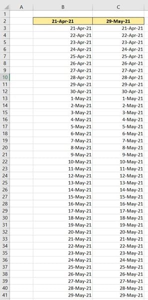 Lo contrario aplicaría para la columna C, a partir de C3 hasta C, colocar la fecha ahora mayor, en la celda C2, de ese rango de fechas.