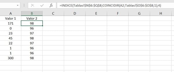 =INDICE(Tablas!$N$6:$Q$8;COINCIDIR(A2;Tablas!$O$6:$O$8;1);4)