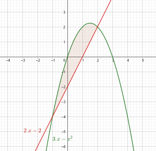 Calcule el área limitada por las gráficas de las funciones f (x) = 3x-x^2 y g (x) = 2x-2