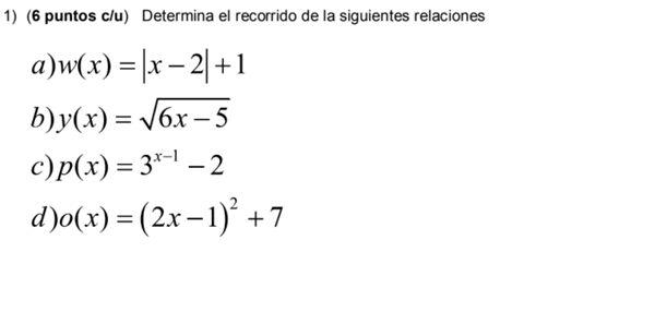 $$\begin{align}&o(x)=(2x-1)^2+7\\&es\ lo\ mismo\\&y=(2x-1)^2+7\\&\\&Función\ inversa\\&y = (2x -1) * (2x - 1) + 7\\&y = 4x^2 - 2x - 2x + 1 + 7\\&y = 4x^2 - 4x + 8\\&4x^2 - 4x + 8 -y = 0\\&\\&Paralelistmo\ con\ la\ forma:\\&ax^2 + bx + c = 0\\&Entonces:\\&a = 4\\&b = -4\\&c = (8 -y)\\&\\&fórmula\ general\\&x = \frac{-b \frac{+}{-}\sqrt{b^2 -4ac}}{2a}\\&x = \frac{-(-4) \frac{+}{-}\sqrt{-4^2 -(4)(4)(8-y)}}{2(4)}\\&x = \frac{4 \frac{+}{-}\sqrt{16 -128+16y}}{8}\\&\\&Debemos\ encontrar\ el\ número\ que\ está\ dentro\ de\ la\ la\ raíz\ sea\ mayor\ o\ igual\ cero\\&en\ esta\ ecuación:\\&16 -128+16y\\&Despejamos\ y\\&16y -112 = 0\\&16y = 112\\&y = 112 / 16\\&y = 7\\&\\&o(x) \ge 7\\&Recorrido\ [7, \infty )\\&\end{align}$$Lo anterior significa que o(x) puede tomar valores desde el 7 positivo hasta el infinito.