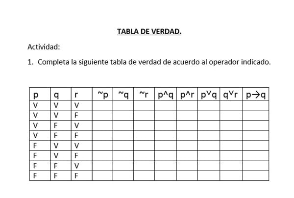 Completa la siguiente tabla de verdad de acuerdo al operador indicado