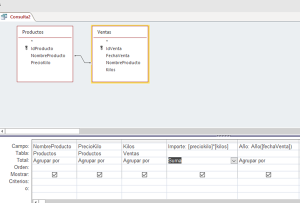 Tengo dos tablas en acces, una tabla de ventas, en donde vienen los kilos vendidos de diferentes frutas y en otra tabla el precio por kilo de cada fruta en euros, quisiera saber si se puede hacer una consulta que me arroje cuanto se pago por año de cada kilo de fruta vendido