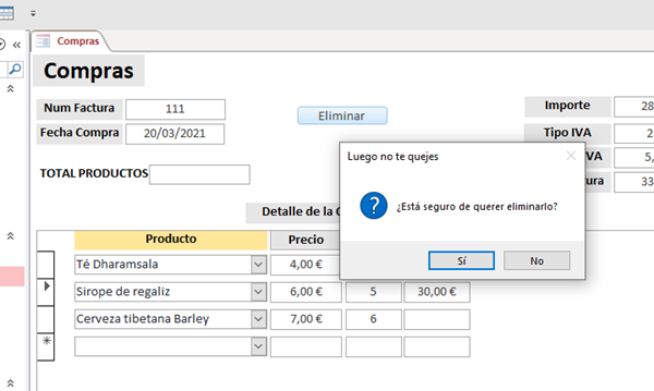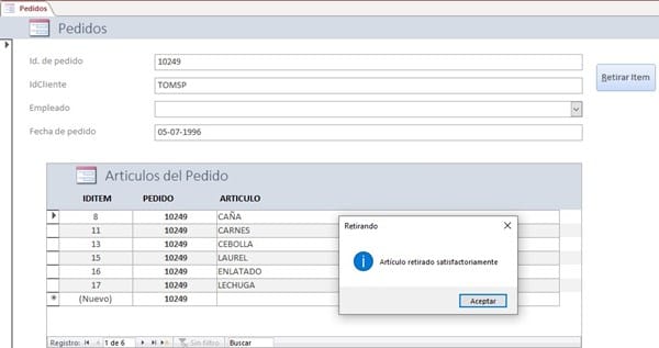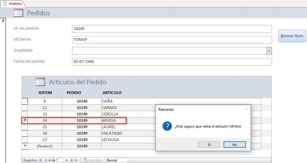 Tengo un formulario principal con un subformulario continuo relacionados por el campo Expediente. La idea es poder eliminar registros del subformulario desde un botón ubicado en el formulario principal y que antes de ser eliminado por el usuario, le pregunte si realmente quiere eliminar ese registro.