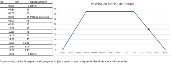 Un grupo de turistas parten a las 7:00 hs del hotel y viajan en micro a visitar un parque acuático ubicadoa 75 km; permanecen en el lugar por tres horas y luego regresan al hotel. El viaje de ida fue de 1 hora ymedia y el de vuelta de 2 horas (suponer que en ambos casos la velocidad del micro ha sido constante).