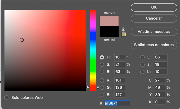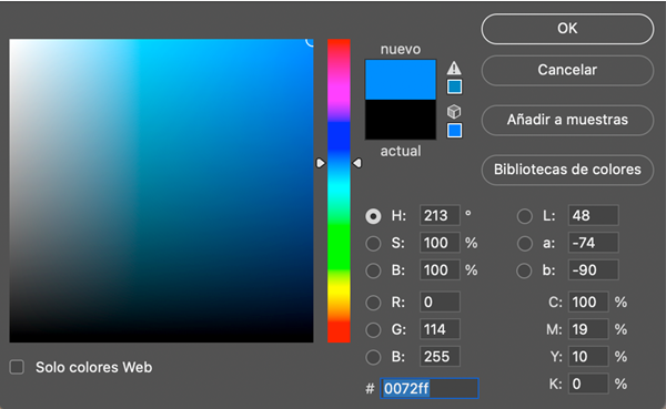 En este caso tenemos un color azulado (recuadro con etiqueta "nuevo") que está formado por 255 de azul, 114 de verde y 0 de rojo (valores RGB).