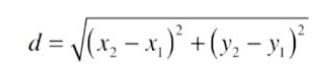 d = raíz( (x2 - x1) ^2 + (y2 - y1)^2 )