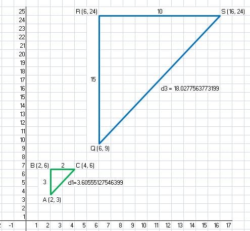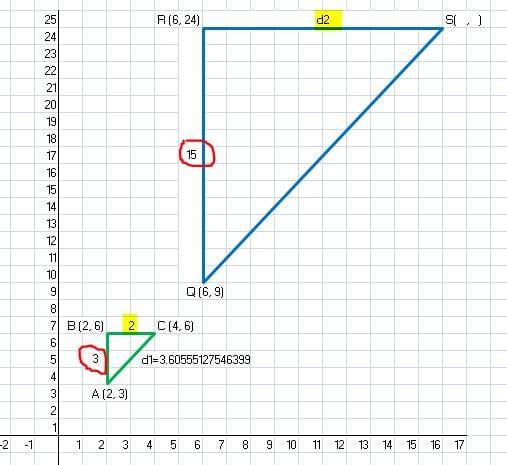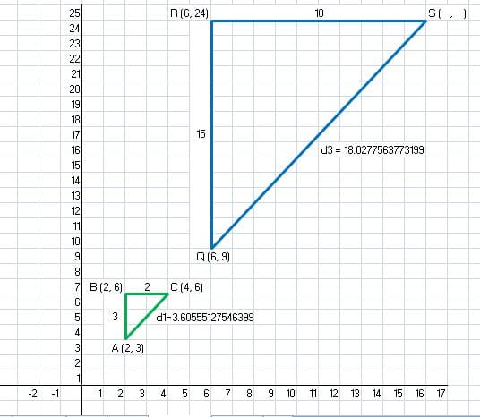 de los puntos Q (6, 9) y S( , ) tenemos la distancia = 18.0277563773199