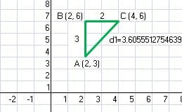 d= raíz( (4 - 2) ^2 + (6 - 3)^2 )