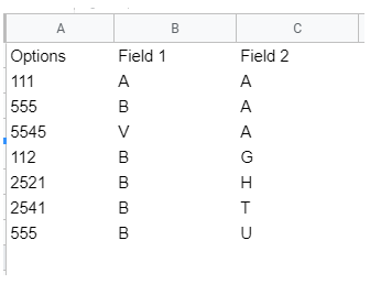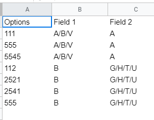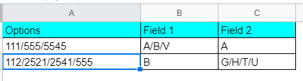 Hasta ahí, todo ok. Ahora necesito que haga lo mismo, pero que considere también los textos separados de las segunda y tercera columna mediante barras diagonales y le asigne a cada fila, en el mismo orden que están escritas inicialmente, cada uno de los elementos. Por ejemplo, si la primera columna tenemos 111/555/5545 y en la segunda A/B/C, el código debe asignar a 111 el valor A, a 555 el valor B y a 5545 el valor C. Del mismo modo, asignarían para cada elemento de la segunda fila (112/2521/2541/555) los valores G, H, T y U, respectivamente. Los valores de la segunda columna y la tercera tendrán siempre 1 elemento o bien tantos como haya en la primera.
