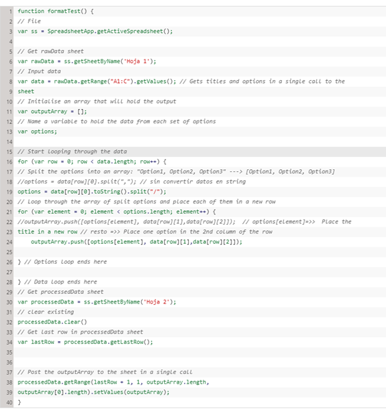He adaptado el código de google apps script para que separe y escriba en otra hoja cada uno de los códigos de la primera columna en varias filas, tantas como códigos haya en cada celda, manteniendo los textos del resto de las columnas. Este seria el resultado (figura 2):
