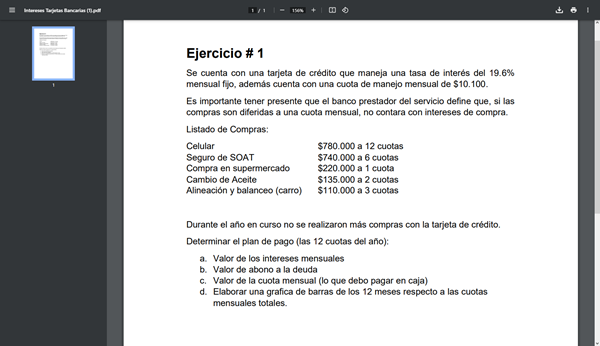 Durante el año en curso no se realizaron más compras con la tarjeta de crédito. Determinar el plan de pago (las 12 cuotas del año): a. Valor de los intereses mensuales b. Valor de abono a la deuda c. Valor de la cuota mensual (lo que debo pagar en caja) d. Elaborar una grafica de barras de los 12 meses respecto a las cuotas mensuales totales
