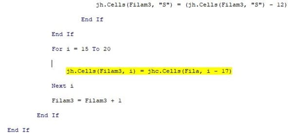 For i = 15 To 20 jh.Cells(filam3, i) = jhc.Cells(fila, i - 17)