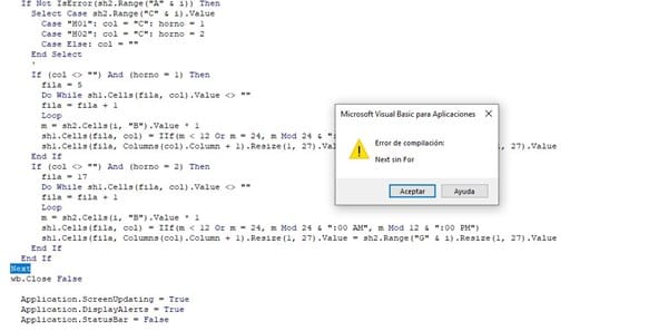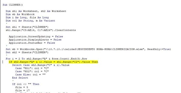 Sub CLINKER() Dim sh1 As Worksheet, sh2 As Worksheet Dim wb As Workbook Dim i As Long, fila As Long Dim col As String, m As Variant, horno As Integer ' Set sh1 = Sheets("CLÍNKER") sh1.Range("C5:AE14, C17:AE26").ClearContents Application.ScreenUpdating = False Application.DisplayAlerts = False Application.StatusBar = False ' Set wb = Workbooks.Open("\\10.7.10.1\calidad\SEGUIMIENTO HORA-HORA\CLINKERIZACION.xlsx", ReadOnly:=True) Set sh2 = Sheets("CLINKER") ' For i = 2 To sh2.Range("A" & Rows.Count).End(3).Row If sh2.Range("A" & i).Value = sh1.Range("C2").Value Then If Not IsError(sh2.Range("A" & i)) Then Select Case sh2.Range("C" & i).Value Case "H01": col = "C" Case "H02": col = "C" Case Else: col = "" End Select ' Select Case sh2.Range("C" & i).Value Case "H01": horno = 1 Case "H02": horno = 2 Case Else: col = "" End Select If (col <> "") And (horno = 1) Then fila = 5 Do While sh1.Cells(fila, col).Value <> "" fila = fila + 1 Loop m = sh2.Cells(i, "B").Value * 1 sh1.Cells(fila, col) = IIf(m < 12 Or m = 24, m Mod 24 & ":00 AM", m Mod 12 & ":00 PM") sh1.Cells(fila, Columns(col).Column + 1).Resize(1, 27).Value = sh2.Range("g" & i).Resize(1, 27).Value End If If (col <> "") And (horno = 2) Then fila = 17 Do While sh1.Cells(fila, col).Value <> "" fila = fila + 1 Loop m = sh2.Cells(i, "B").Value * 1 sh1.Cells(fila, col) = IIf(m < 12 Or m = 24, m Mod 24 & ":00 AM", m Mod 12 & ":00 PM") sh1.Cells(fila, Columns(col).Column + 1).Resize(1, 27).Value = sh2.Range("g" & i).Resize(1, 27).Value End If End If Next wb.Close False Application.ScreenUpdating = True Application.DisplayAlerts = True Application.StatusBar = False If sh1.Range("C5, C17") = "" Then MsgBox "No hay datos reportados para este día" End If End Sub