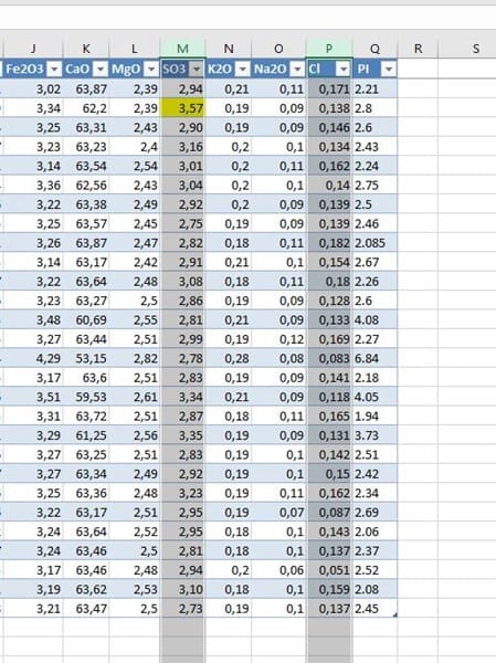 Los datos provienen de un libro llamado Químicos y debo extraer solo los datos de la columna M y P solamente al libro llamado Cemento
