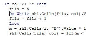 For i = 7 To sh2.Range("A" & Rows.Count).End(3).Row If Not IsError(sh2.Range("A" & i)) Then If sh2.Range("A" & i).Value = sh1.Range("C2").Value Then Select Case sh2.Range("C" & i).Value Case "M3": col = "C" Case "M4": col = "L" Case "M5": col = "U" Case Else: col = "" End Select ' If col <> "" Then fila = 5 Do While sh1.Cells(fila, col).Value <> "" fila = fila + 1 Loop m = sh2.Cells(i, "B").Value * 1 sh1.Cells(fila, col) = IIf(m < 12 Or m = 24, m Mod 24 & ":00 AM", m Mod 12 & ":00 PM") sh1.Cells(fila, Columns(col).Column + 1).Resize(1, 7).Value = sh2.Range("D" & i).Resize(1, 7).Value End If End If End If Next