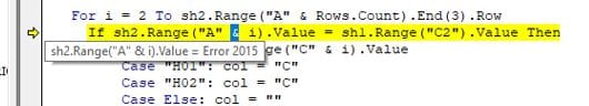 Select Case sh2.Range("C" & i).Value Case "H01": col = "C": horno = 1 Case "H02": col = "C": horno = 2 Case Else: col = "" End Select '