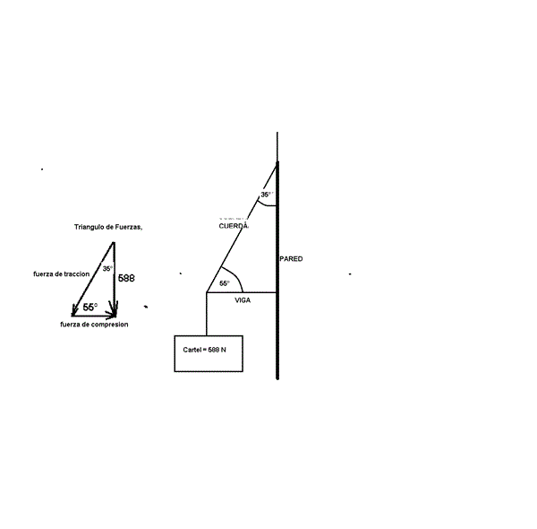 Un anunció pesa 588N y cuelga de una estructura sujetado por una cuerda que tiene un ángulo de 55grados Calcula el empuje que g