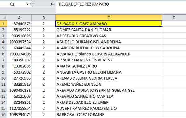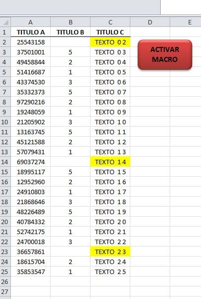 Como se puede observar en la tabla, hay 3 columnas (A, B y C), necesito una macro que al darle clic elimine los números que están a la izquierda, osea en la columna B; siempre y cuando los nombres de la columna C estén de color amarillo, como se puede ver en la imagen.