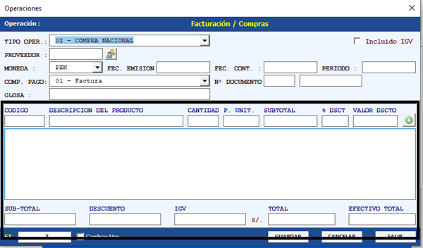 Algo similar a la siguiente imagen teniendo solo la descripción del producto con filtro para seleccionar y el valor total. Si se desea editar una boleta/factura se tendrá la opción de realizarlo.