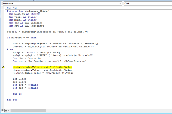 Necesito ayuda la verdad soy nuevo y bueno quiero hacer una búsqueda desde un botón buscar y que el resultado me lo asigne a una cajas de texto en el formulario, tengo la tabla cliente con los campos cedula nombre y celular. Les dejo el código