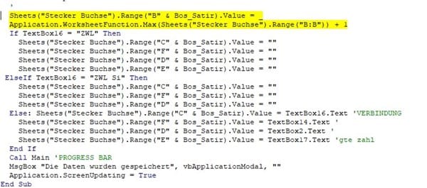 ' Sheets("Stecker Buchse").Range("B" & Bos_Satir).Value = _ ' Application.WorksheetFunction.Max(Sheets("Stecker Buchse").Range("B:B")) + 1 ' If TextBox16 = "ZWL" Then ' Sheets("Stecker Buchse").Range("C" & Bos_Satir).Value = "" ' Sheets("Stecker Buchse").Range("F" & Bos_Satir).Value = "" ' Sheets("Stecker Buchse").Range("D" & Bos_Satir).Value = "" ' Sheets("Stecker Buchse").Range("E" & Bos_Satir).Value = "" ' ElseIf TextBox16 = "ZWL Si" Then ' Sheets("Stecker Buchse").Range("C" & Bos_Satir).Value = "" ' Sheets("Stecker Buchse").Range("F" & Bos_Satir).Value = "" ' Sheets("Stecker Buchse").Range("D" & Bos_Satir).Value = "" ' Else: Sheets("Stecker Buchse").Range("C" & Bos_Satir).Value = TextBox16.Text 'VERBINDUNG ' Sheets("Stecker Buchse").Range("F" & Bos_Satir).Value = TextBox14.Text ' ' Sheets("Stecker Buchse").Range("D" & Bos_Satir).Value = TextBox2.Text ' ' Sheets("Stecker Buchse").Range("E" & Bos_Satir).Value = TextBox17.Text 'gte zahl ' End If