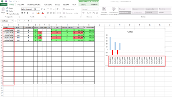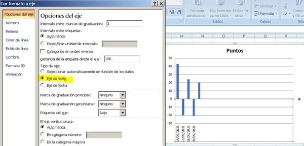 ¿Cómo hacer que en el eje del gráfico aparezcan estrictamente las fechas que aparecen en las celdas de la columna A, aunque no lleven orden y se salten algunas fechas?