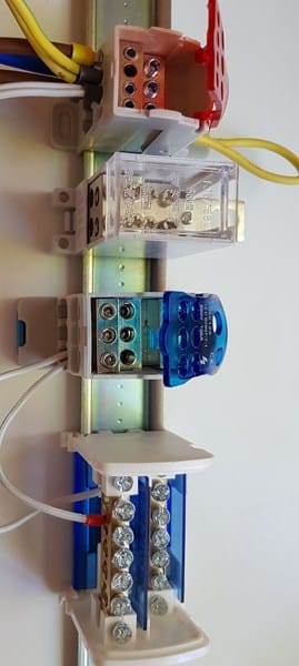 2) Se quedan "en el aire" con un lío de cables fenomenal, y cuando tienes que modificar algo es un horror sacar todo ese manojo de cables arrugado de la caja, con el riesgo de que alguno se suelte, aclararte con ellos y volverlos a meter apretados. Así que hace años opté por usar borneras sobre carril y cable grimpado, que me da mucha más claridad y me permite toquetear en el futuro sin tener que sacar todo el cableado retorciéndolo.