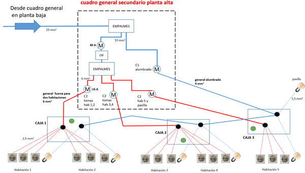 Pero en vez de llevar las líneas al cuadro general, monta un cuadro secundario en la segunda planta, y allí se instala un magnetotérmico de tomas por cada habitación.