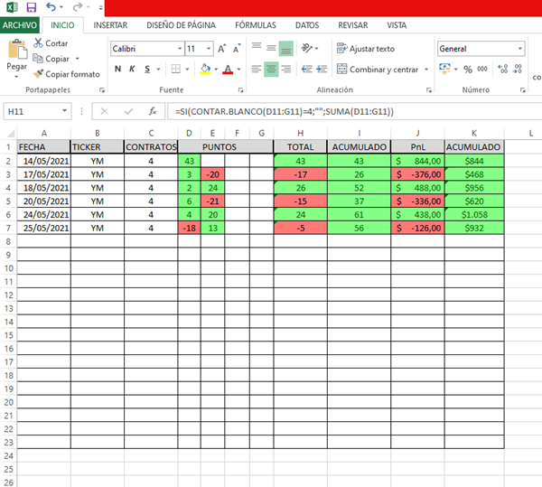 En todas las fórmulas hay que tener en consideración que dia a dia se va a ir haciendo el cálcual, lo que quiere decirse que hay que tener en cuenta que al comienzo hay muchas celdas sin rellenar y se irán rellenando dia a dia, con lo que las fórmulas deben tener la condición de que las celdas estén rellenas. No vale que cuenten en blanco.
