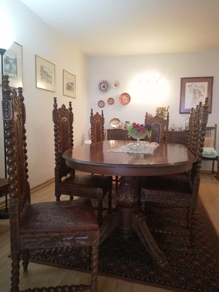 Mesa de comedor al estilo colonial de pies centrales en trípode, también talladas. Tablero ampliable para más comensales.