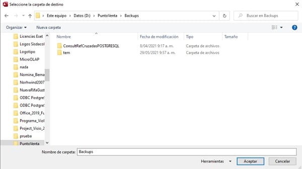 Observe que he seleccionado la carpeta que está en la ubicación D:\PuntoVenta\Backups. En esta carpeta tengo unos archivos con extensión backup, son copias de la base de datos PostgreSQL.