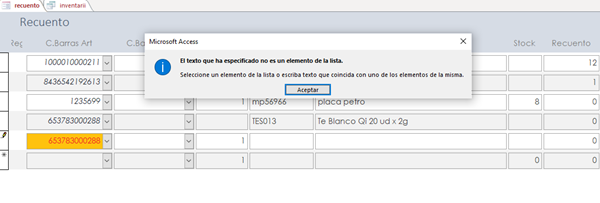 Buenos días, estoy realizando una base de datos para toma de inventarios, el problema es que el código de barras lo leo con pistola y me lo coloca en el cuadro combinado, sabiendo que existe el código me dice que el valor no existe, el problema es que hay veces que el código hay que meterlo de forma manual ( las menos ) y leyéndolas con la pistola de códigos, gracias por su ayuda y dejo una imagen del formulario