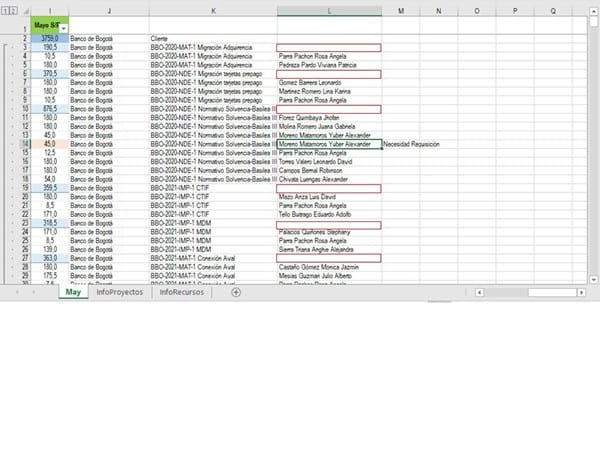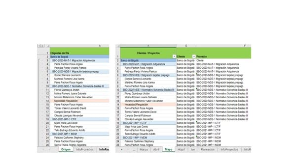 El archivo me lo entregan con la columna A con CLIENTES, PROYECTO, COLABORADORES Y NECESIDADES. Necesito que cada una este en una columna diferente, con su información correspondiente. Cree una BBDD con archivos diferentes de cada uno. Hasta ahí llegué.