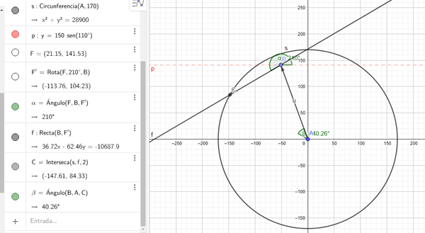 Llega al punto B donde continua volando con una dirección de 210°, una distancia de X en kilómetros hacia el punto C, de tal forma que llega a 170 km del punto A y el ángulo formado por las trayectorias AB y AC es de 50°