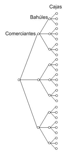 3 comerciantes subieron al barco 3 baúles, con 3 cajas que contienen en su interior, 3 pañuelos de seda, cuyo valor es de 3 monedas de plata.
