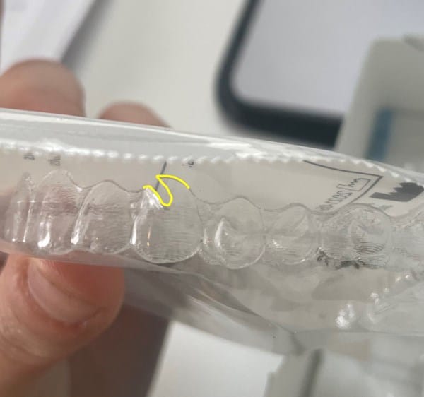 Hace tres días me pusieron invisaling y me esta saliendo una llaga porque el borde de los retendores del canino izquierdo superior tiene una forma de "punta" que se me clava en el labio superior (Adjunto una fotografía). He mirado el resto de retendores y todos tienen esta forma. No entiendo muy bien porque tiene esa forma porque en ese canino no tengo ningún atache.