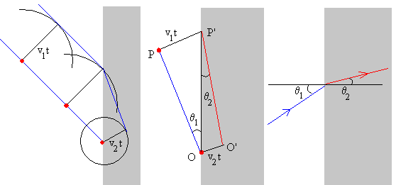 V1 / V2 = sen fi1 / sen fi2 ... V1 y V2 velocidad de la onda ( plana) en ambos medios. Fi 1 y fi 2 angulos de entrada y salida medidos respecto del la vertical a la superficie de separacion de ambos medios.