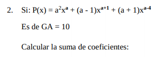 P(x) es igual a a2xa + (a - 1)xa+1 + (a + 1)xa-4 y GA es igual a 10. Calcula la suma de los coeficientes