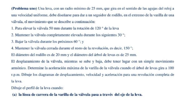 Determinar la aceleración máxima de la varilla de la válvula cuando el árbol de levas gira a 100r.p.m...