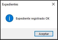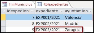 Imaginemos que en el primer formulario elijo como Ayuntamiento a "Madrid" y pulso el botón "Dar de Alta al Expediente". Automáticamente me llevaría a ese otro formulario donde el código generado automáticamente para ese expediente sería "EXP001/2021" y me lo graba en la tabla "Expedientes" que tiene tres campos: