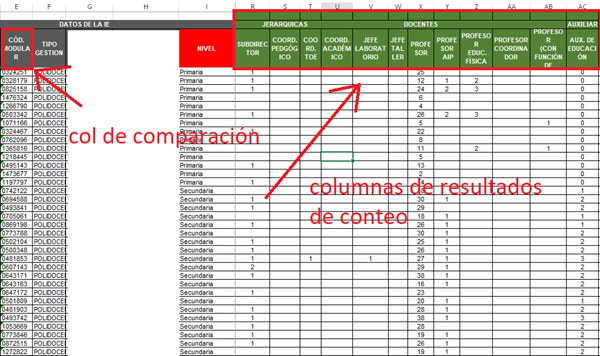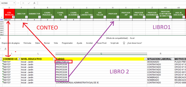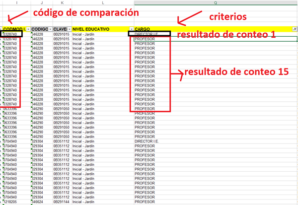 En el libro2 en la columna "Q" están los diferentes criterios a realizar el conteo en mi ejemplo el código 0328740 existe 16 registros como observa existe 1 como DIRECTOR y 15 como docente este resultado se necesita.