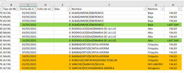 Tengo una base de 3,000 registros y deseo saber el ultimo registro de Fecha de cada trabajador (Columna C), es por eso que en la columna H, tengo está fórmula:
