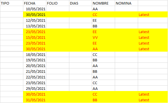 =SI(C2=0,"",SI(CONTAR.SI.CONJUNTO($F$1:F2,F2,$C$1:C2,"31/05/2021"),SI(C2=0,"",SI(CONTAR.SI.CONJUNTO($F$1:F2,F2,$C$1:C2,"<31/05/2021"),"LAST DAY",""))))