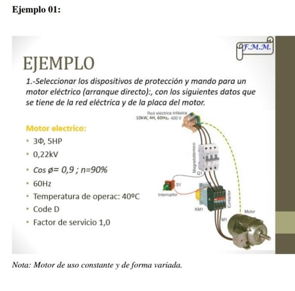 El contactor deberá pensarse al menos para la corriente nominal del motor. La llave termomagnética usualmente se dimensiona para 1.25 Corriente nominal de funcionamiento y de curva "C".