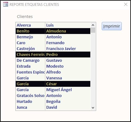 Tengo un archivo de Access con una sola tabla perteneciente a una comunidad de vecinos. A partir de esa tabla he hecho varias consultas, un formulario para introducir, eliminar, editar o buscar más socios y tengo un archivo de etiquetas donde aparecen los campos del nombre y apellidos y la dirección que son los que se imprimen cuando hay que enviar alguna carta a los socios. Pues bien, mi problema está en que a veces tengo que enviar una carta sólo a unos cuantos y no a todos los de la lista y claro si le doy a imprimir al informe de etiquetas salen todos y yo sólo quiero imprimir los que necesito. Entonces, ¿cómo puedo hacer eso? He intentado seleccionar unos cuantos y a ver si se imprime la selección pero no hay forma. También he hecho una consulta con esos campos y con un botón de búsqueda para encontrar el socio en cuestión y un botón de imprimir pero me imprime todo. Además la lista es muy extensa y me tengo que parar a buscar el socio o los socios que necesito.