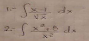 $$\begin{align}&1)\\&\int \frac{x-1}{\sqrt{x}} dx = \int \frac{x}{\sqrt{x}} - \frac{1}{\sqrt{x}}dx = \\&\int \sqrt{x} - \frac{1}{\sqrt{x}}dx = \int \sqrt{x} \ dx - \int \frac{1}{\sqrt{x}}dx \\&\text{Lo podés resolver así o, como me gusta a mí, ya que se ve más fácil}\\&\int x^{1/2} dx - \int x^{-1/2} dx\\&2)\\&\int \frac{x^2+8}{x^2} dx = \int \frac{x^2}{x^2}+\frac{8}{x^2} dx = \\&\int 1+\frac{8}{x^2} dx = \int dx+\int \frac{8}{x^2} dx \\&\text{Nuevamente, la segunda integral la podés pensar como } \int 8x^{-2} dx\end{align}$$